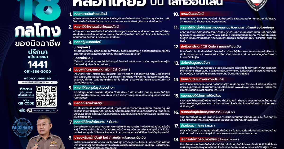 18 กลโกงของมิจฉาชีพ 17 พฤศจิกายน 2565 โดย admin / ข่าวประชาสัมพันธ์,ข่าวกิจกรรม FacebookFacebookXXLINELine