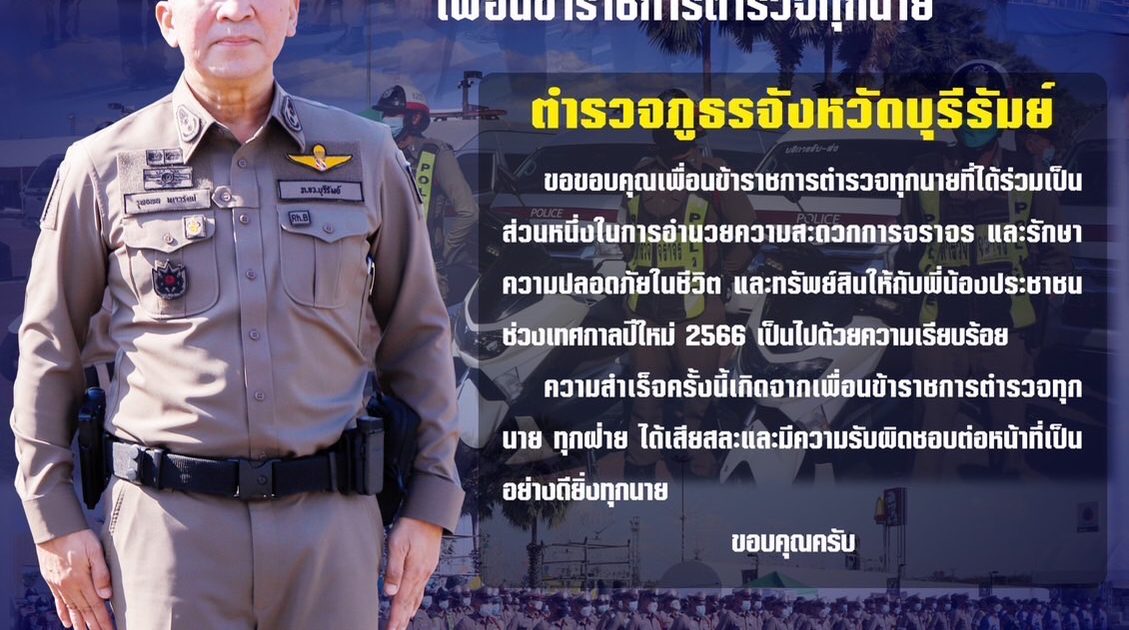 ตำรวจภูธรจังหวัดบุรีรัมย์ ขอขอบคุณเพื่อนข้าราชการตำรวจทุกนาย ที่ได้ร่วมเป็นส่วนหนึ่งในการอำนวยความสะดวกการจราจร และรักษาความปลอดภัยในชีวิตและทรัพย์สิน ให้กับพี่น้องประชาชน ช่วงเทศกาลปีใหม่ 2566 เป็นไปด้วยความเรียบร้อย
