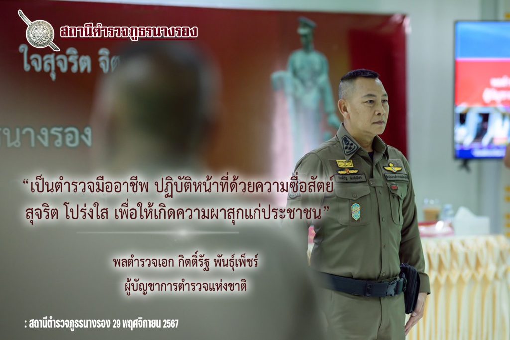 วันที่ 28 พฤศจิกายน 2567 เวลา 13.30 น. พล.ต.ต.รุทธพล เนาวรัตน์ ผบก.ภ.จว.บุรีรัมย์ พร้อมด้วย พ.ต.อ.ก้องชาติ เลี้ยงสมทรัพย์ รอง ผบก.ภ.จว.บุรีรัมย์, พ.ต.อ.พงศ์พันษ์ พลวงษ์ศรี รอง ผบก.ภ.จว.บุรีรัมย์, พ.ต.อ.กัมพล วงษ์สงวน ผกก.สภ.นางรอง และข้าราชการตำรวจ สภ.นางรอง